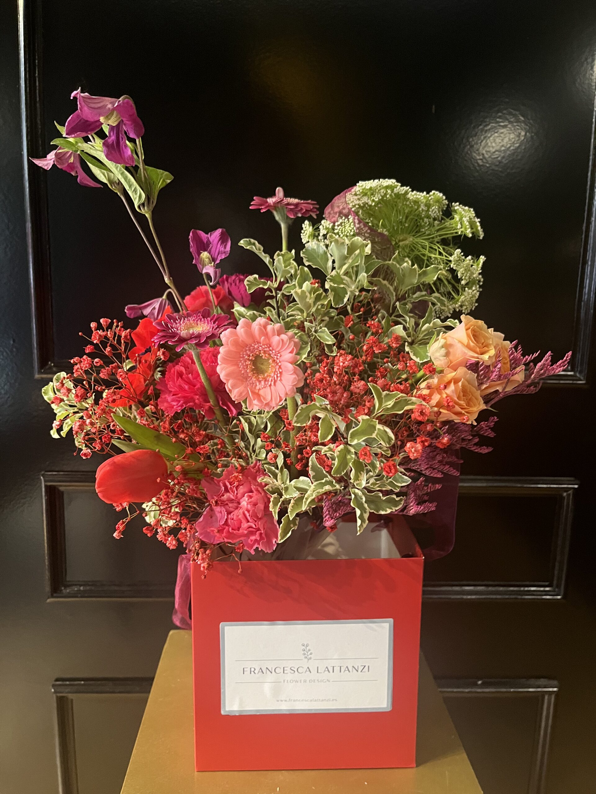 Sorprende con una bolsa floral elegante y sofisticada, elaborada con flores frescas de temporada. Este arreglo premium combina flores y verdes de temporada, creando una composición delicada, alegre y moderna. Presentado en una bolsa decorativa de diseño exclusivo, es el regalo perfecto para celebrar cumpleaños, aniversarios, agradecimientos o simplemente para emocionar. Las flores van dentro de una bolsa con agua para que lleguen frescas.